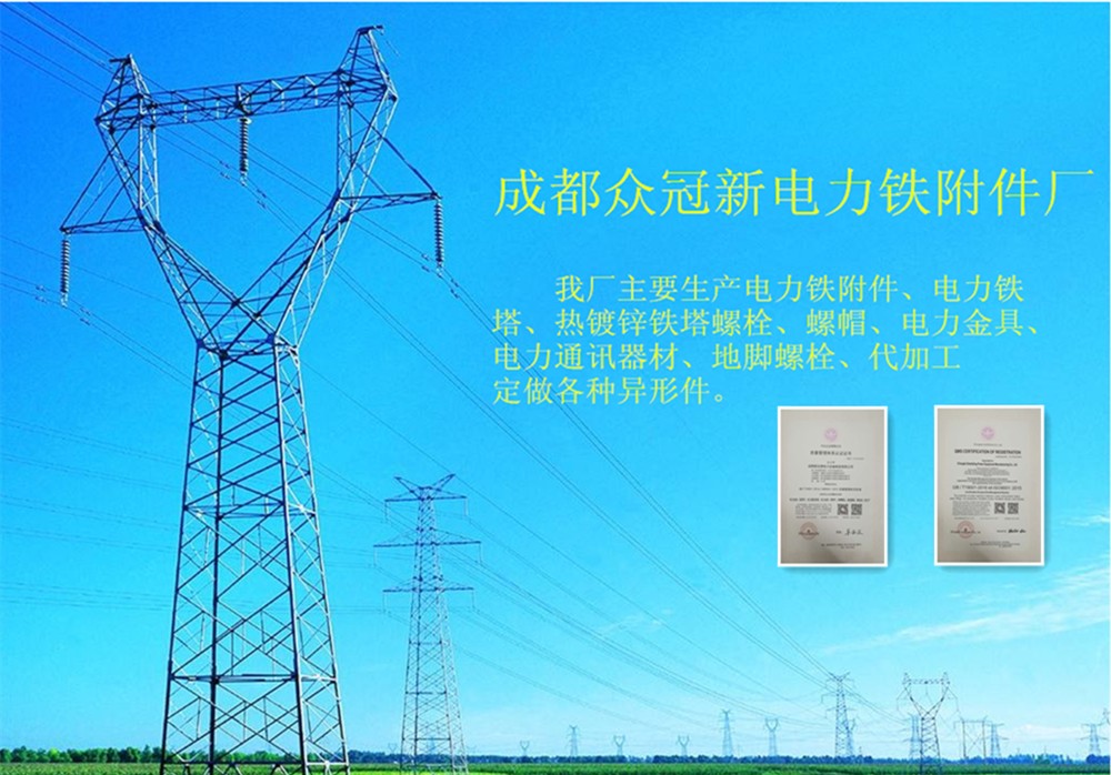 成都眾冠新五金交電有限公司成立于2007年,位于有著天府之國的四川成都,公司主導產品為:熱鍍鋅螺栓、鐵塔螺絲、電力鐵塔、鐵附件、通訊器材、電力金具、金橋焊條、防水材料、建筑配件、家裝。廣泛應用于:電力、鐵路、船舶、工礦、通訊、建筑、防水工程等。